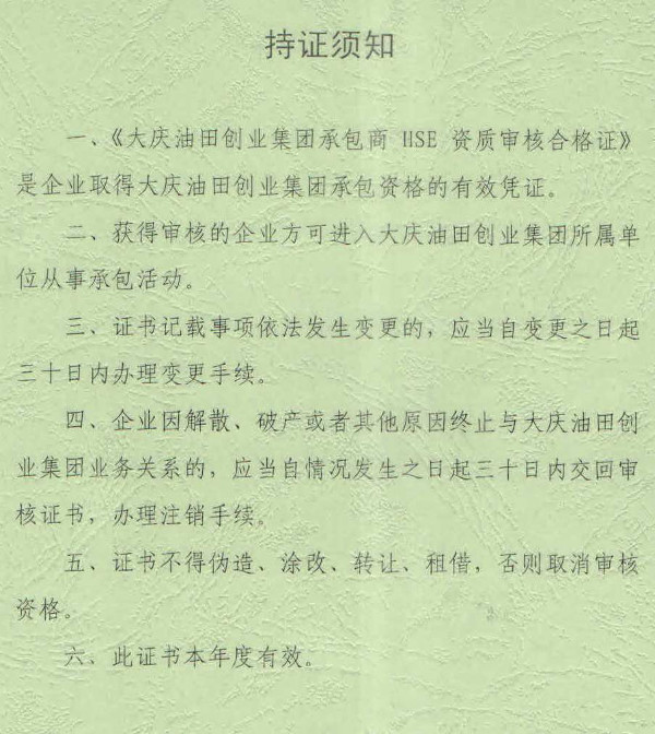 圖片新聞:大慶油田創(chuàng)業(yè)集團承包商HSE資質審核合格證(2018年度承攬服務類)